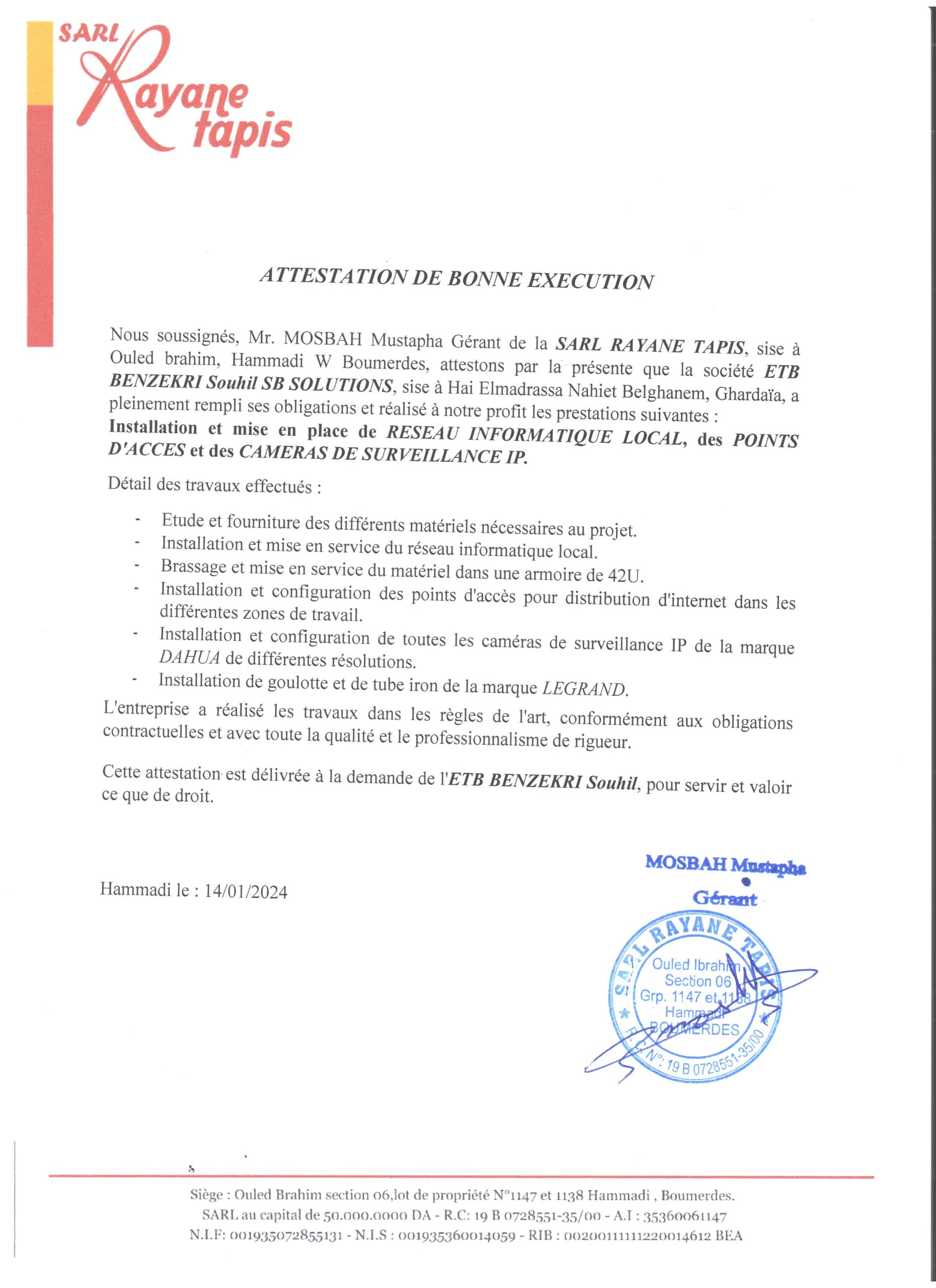 SB SOLUTIONS DES SOLUTIONS INNOVANTES, DES RÉSULTATS EXCEPTIONNELS Plus de Details Services Nous proposons les meilleures solutions Nous proposons des solutions en réseaux informatiques et téléphonie, avec un service national. Notre expertise garantit un support technique de qualité et des solutions sur mesure pour les entreprises. Explorer Réseaux Informatiques Camera Surveillance Systeme Sonorisation System Climatisation Réseaux Téléphoniques Système Alarme & contrôle d’accès Fibre Optique Nos Partenaires Nos Réussite
